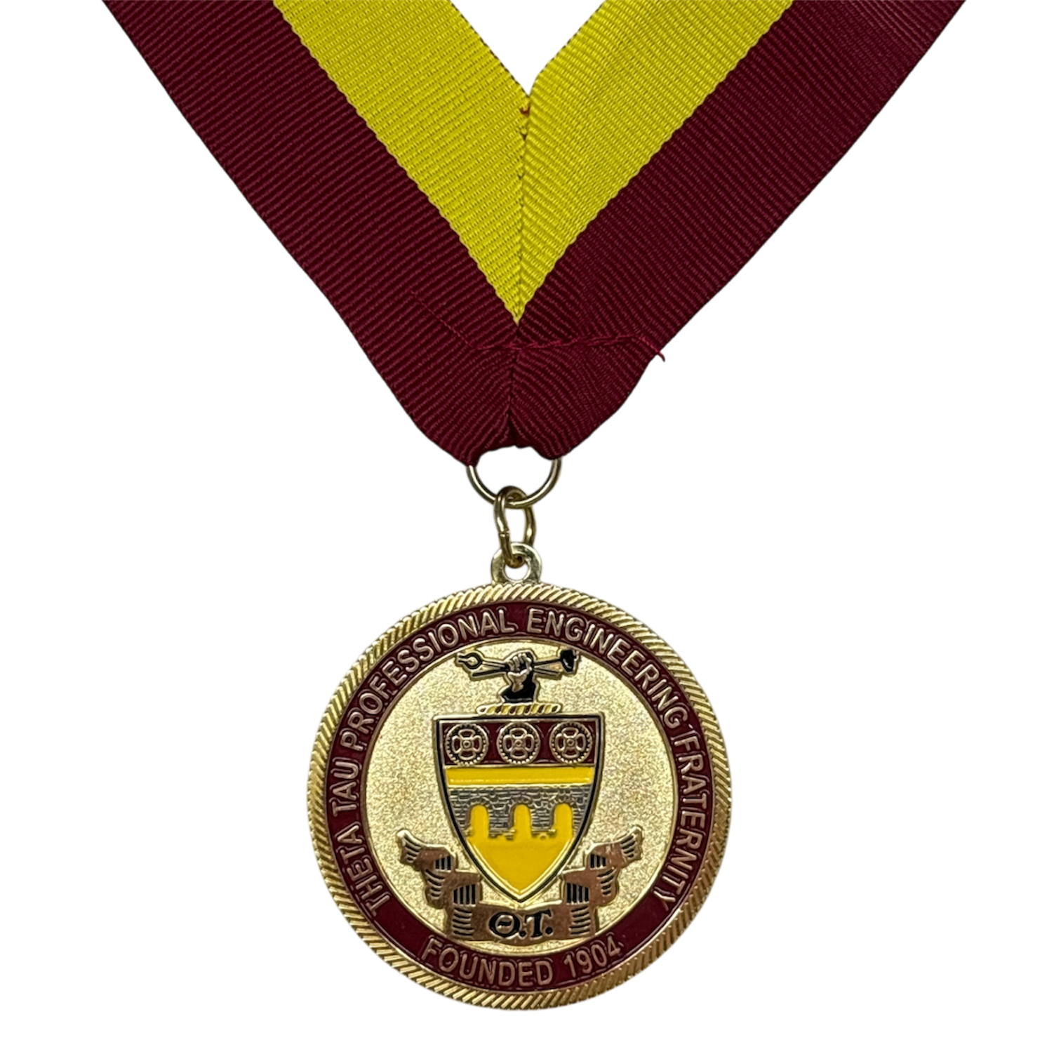 Graduation medallion on a red and gold neck ribbon. Medallion has the Coat of Arms engraved on it.
